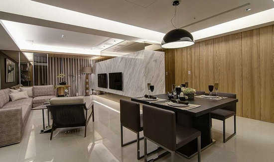 编辑点评:长形的大理石电视墙从书房延伸至餐厅处转折90度导角,结合上下茶镜放大空间,并串连四个机能场域。
