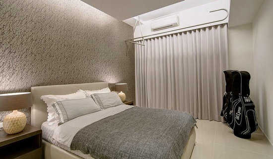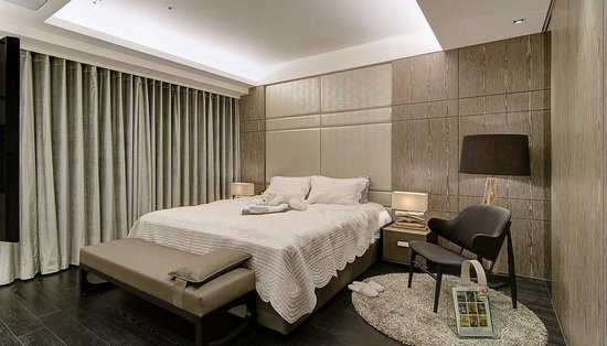 编辑点评:利用灯光效果所需要的厚度,在床头两侧隐藏置物空间。