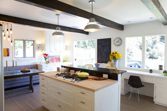 编辑点评:墙壁上条形挖空,嵌入玻璃的窗户设计,提亮空间,削弱厨房的油烟味,加强其通风性。此外,还开阔视野,愉悦用厨者身心。