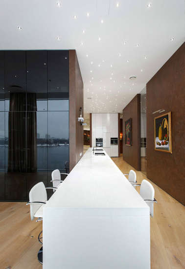 编辑点评:超长的白色吧台几乎横贯公寓的一半宽度,充分地延伸了视线,更为厨房创造了充裕的操作台空间和拓展了用餐区。