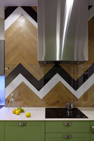 编辑点评:仿木质材料装修的背景墙纹理清晰,循着其纹理增加黑白波纹线条为空间营造了动感,中部增加玻璃挡板防止了油污飞溅到墙壁,也方便了清理。