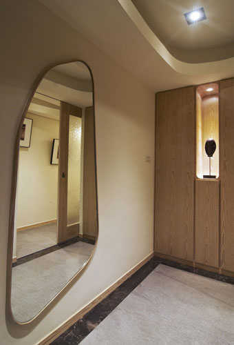 编辑点评:顺势着集层木材纹理,京彩设计将主卧片从餐柜位置改向,动线的整合让空间更舒适。