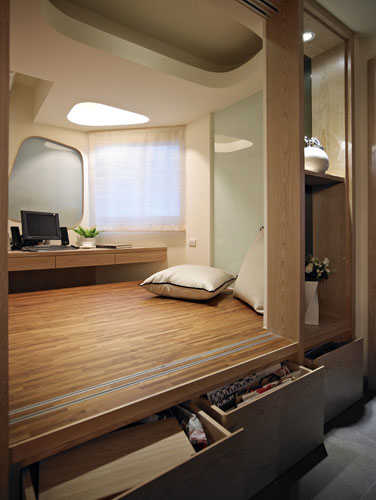 编辑点评:架高地板隐藏深达180cm的抽屉,可收纳所有生活杂物,高度配置后,家人可以席地而坐,在书桌前当成椅子使用。