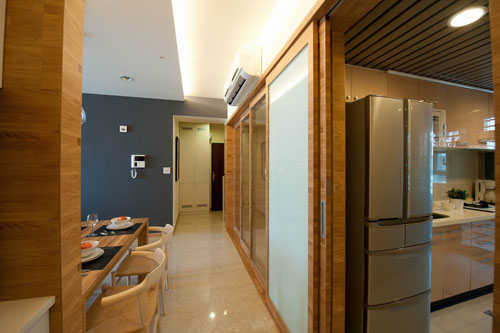 编辑点评:三片式连动加上烤漆玻璃的固定门片,和室空间有了开放的弹性变化。