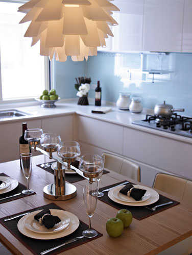 编辑点评:厨房墙面使用浅色系的烤漆玻璃,不但视觉上清爽无压,也让使用者更容易清洁,一改厨房油腻阴暗的印象。