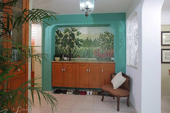 欧式田园风格的玄关柜外观突出凹凸感,弧形线条优美流畅,多选择纯实木为骨架,木材种类多用松木和椿木,色调以白色、粉色和绿色为主,柜体表面带有纯手工的雕刻,突出华丽与精美的特点。