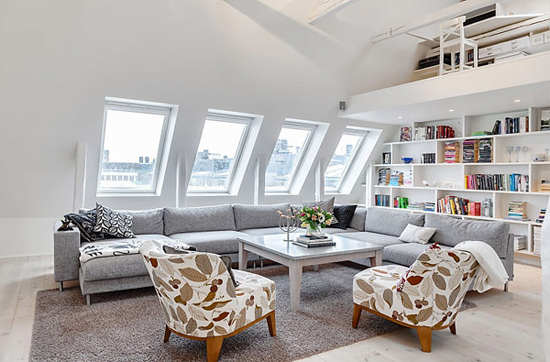 编辑点评:因房屋结构形成的倾斜墙体让空间显得十分立体,四个相连的大窗户为客厅注入足够的光源,室内亮度得以保证。
