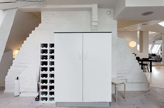 编辑点评:走廊背景墙塑造成为充满质感的扇形墙体,与层次鲜明的吊顶相搭配让空间显得更具个性魅力,其墙面更被活用为冷藏收纳区和小酒柜,美观又实用。