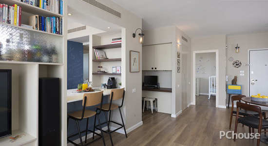 编辑点评:隔断厨房和客厅的墙体中部被挖空成为厨房的吧台,也拓宽了操作台面积,充分地利用了墙面创造空间,赋予了小户型一个休闲的好地方,更增加了空间的通透感。