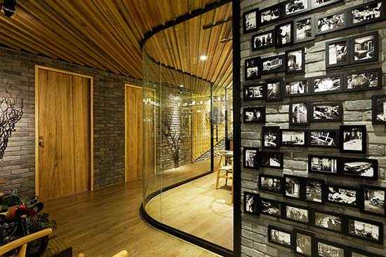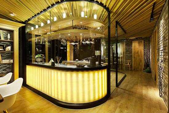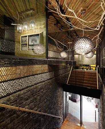 从入口的楼梯开始,原始森林般的粗犷气息便扑面而来。底层堆叠的文化石和借助铁丝网铺就的长炭、卵石等元素,与实木材质的楼梯达成自然的和谐。天花板由不同尺寸的实木条拼组而成,凹凸不平的表面似乎还在散发着丛林的湿润味道,这样的设计在施工中需要统一的规划协调,不可各个区域各自施工,然而当艰难的架构成功后,整个设计的野心也就呼之欲出了。