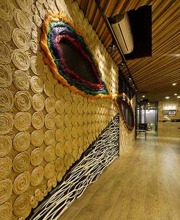 每个团队都需要一个属于自己的图腾,设计师以缠绕的麻布象征团队力量的集合与延伸,并将此置于由天然材料拼接的墙面上,色彩材质的碰撞间,公司的品牌文化清晰可见。