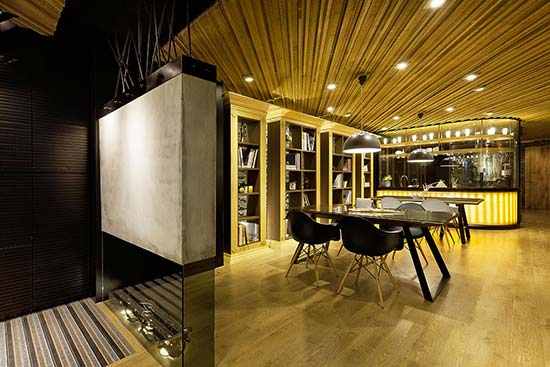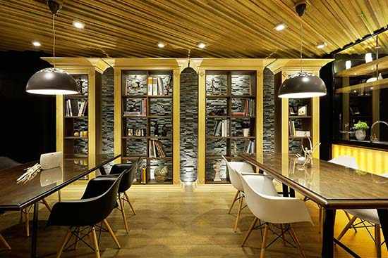 宽广的公共空间提供了轻松的会客氛围,设计师没有采用集中的大吊灯,而是以零星镶嵌在天花板上的小型光源来柔和室内的光线,办公桌与椅子的造型简洁流畅,在这里,时尚与古朴结合得天衣无缝。