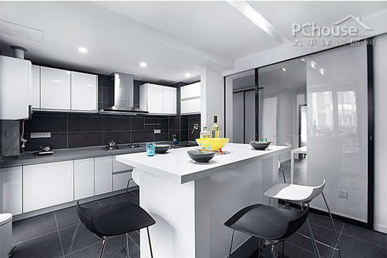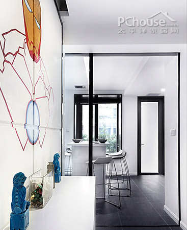 编辑点评:屏风旁就是黑白炫酷的餐厨区。透明玻璃与黑色门框带出现代时尚感与线条感。设计感十足的高脚把现代简约范儿渲染到极致。餐厨区点亮了“简一”的设计主题。