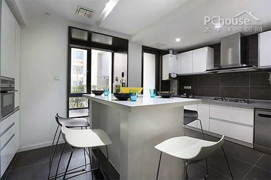 编辑点评:厨房采用开放式布局,遵循整洁的布置原则。餐具用品色泽的清澈与材质的通透共同打造了一层不染的纯净空间。