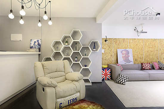 编辑点评:开放式区域的一大亮点还有墙面上的六边形格子酒柜,层叠排列,造型独特。在充当展示功能的同时,也能巧妙地分割视听区与酒吧区。隔而不断,使空间更加通透与开放。