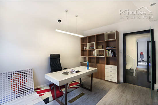 编辑点评:司空见惯的日光灯、木质格子书柜,从这些元素中能看出书房是再简单不过了。然而两幅画的对比,瞬间冲击了视线。马赛克的毛主席头像,撞上英国国旗似的图案,个性搭配的创意让人觉得意味深长。