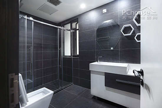 编辑点评:这套“简一”住宅,将黑白灰和六边菱形概念贯穿于整个空间。卫浴空间的六边形墙面镜,简约别致;大小不等的六边形装饰,将美观与实用完美结合;线条感分明的卫浴产品,极具设计感与艺术感。黑白极简的延续,打造出了舒适自在的高品质卫浴环境。