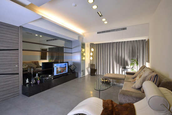 编辑点评:电视墙采用镜面材料,让客厅面积瞬间翻倍,再利用贴纸塑造线条感,空间更有质感。