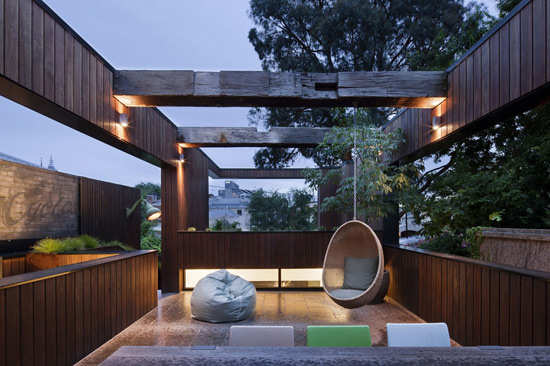 编辑点评:室外休闲区的背景墙中部挖空,省去吊顶设计,塑造了一个半开放式的休闲空间,与自然的充分接近也让空间的舒适度大大增加。