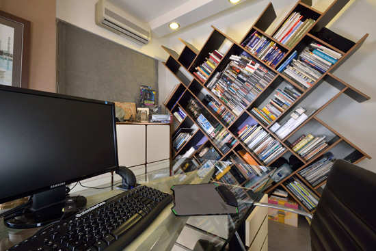 编辑点评:书架设计颠覆常规,在兼顾书籍收纳的情况下,其不规则的结构与外形大大增加了书房的个性魅力。