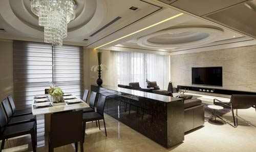 推荐理由:将客厅与餐厅空间隔断的方法不仅是利用沙发或地毯分区,还可以将两个区域的其中一个的地台升高,视觉上明显区分出不同的空间。