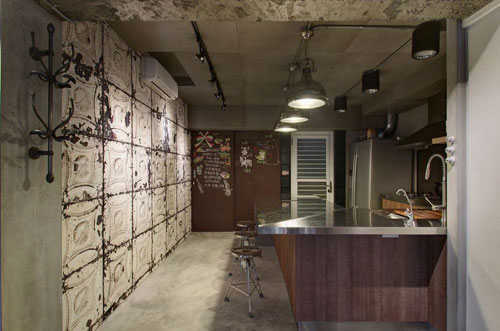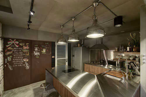 编辑点评:不锈钢台面ㄇ字型厨具与三盏抢眼的聚光灯,呼应LOFE风格当中的工业元素,烹调区的壁面直接将台面的不锈钢上拗,利用材质特性让清洁维护更顺手;摆上几把钢铁小凳,用餐区俨然成形。