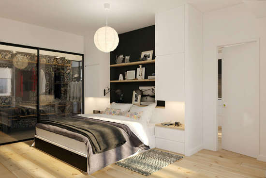 编辑点评:大床省去了床背设计,采用嵌入背景墙的设计,在视觉上与床头墙融为一体,节省了空间,也增强了睡眠区的立体感。