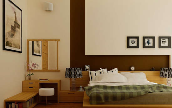 小编的话:和风平台床,低矮和外延床廓是一大特色,设计师延展了这种特性,将床头柜、化妆台、卧室书桌、室内矮座等等元素都融入了一个一体的连绵式设计中,效果大赞。