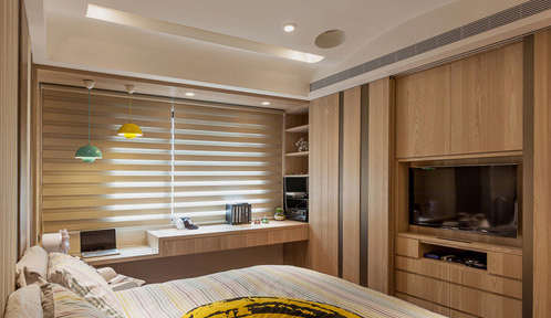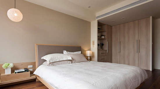 小编的话:同样是全屋定制家具,主人把装置重点放在了床头上,大而隐秘的的整体木质墙面设计,隐藏式的柜门内有存储空间,而开放式的内嵌式搁架上则可以放些装饰品,收纳些时常阅读的书籍。