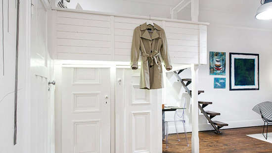 小编的话:此套案例的玄关处以最简洁的方式呈现,进门没有太多的装饰,而是利用了设置在上层的床沿起到挂放衣物的作用。