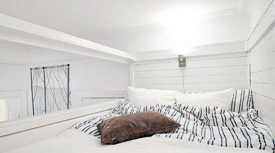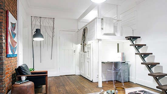 小编的话:顺着小小的阶梯往上走就能看到被设置在上层的睡眠区域,在小户型房型中选择这样的装修方案实为巧妙,既分割开了最私密的睡眠区,又让其他空间看上去宽敞不显杂乱。高高在上的单独的睡眠区域,在如此小空间内定能给主人带来良好的睡眠质量。