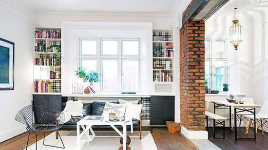 小编的话:整个客厅中放上一个舒适的沙发,背靠窗户,利用窗户两旁的空白墙面作为书架来摆放一些平日所爱的书籍,房间主人聪明的使客厅还起到了书房的作用。而书桌也是巧妙的设置在了通往睡眠区域的楼梯下方,即有空间安全感,又不怎么占地方。
