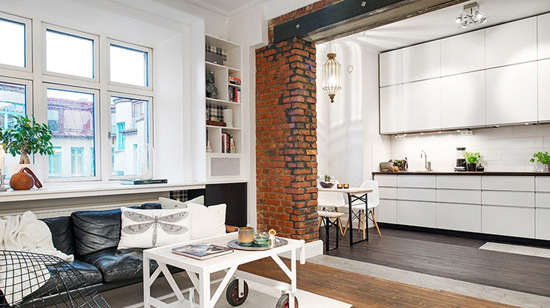 小编的话:客厅旁边的开放式厨房,以橘黄色砖墙隔断与深色地板作为区分功能区域的关键,厨房内的白色整体橱柜一目了然,在不大的空间内意外的给人一种大气的感觉。
