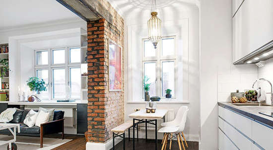 小编的话:厨房边的小窗户前摆放上一张简约的小餐桌,具有特色的吊灯在餐桌上方营造出了些许浪漫气氛。
