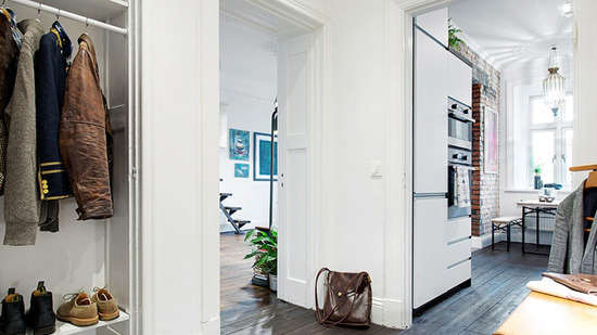 小编的话:穿过厨房就能看到设置在角落里的衣帽间所在之处了,整齐摆放的衣物在内嵌式的衣中显得井井有条。