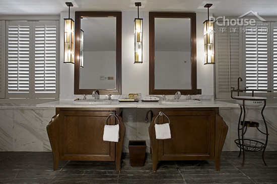 编辑点评:走进卫浴间,感受到的是成双成对的设计与摆设带来的整齐洁净的视觉享受。拒绝张扬,在对称的形式中自发一种沉稳内敛的气场。