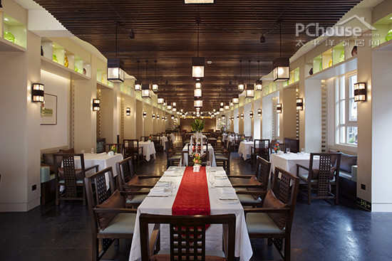 编辑点评:古朴的灯光映照在精致的实木餐椅上,配以绿植的勃勃生机,整个餐厅布置赏心悦目、温馨动人。在现代空间打造浓郁的传统意境,积淀深厚的文化内涵,品美食的同时也能享受视觉和精神的盛宴。