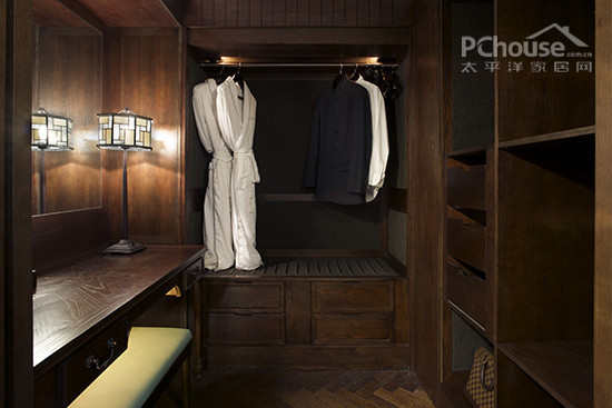 编辑点评:衣帽间在沿袭了整个酒店的风格特色的同时,更显得古朴宁静。两盏台灯的点缀成为点睛之笔。
