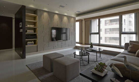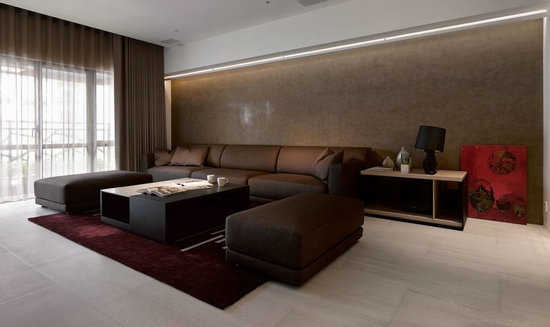 编辑点评:力求设计基调的平衡性,选择有手工肌理的马来漆为沙发主墙,以及仿石材的消光砖为地坪。