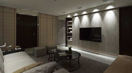 编辑点评:电视墙作为一个量体,以现代几何线条、塑像般的意象环绕着公共领域,其上下处以线性的间照效果,则营造量体的轻盈感。