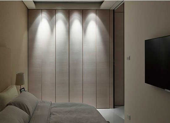 编辑点评:现代简约的床头设计、切割线条的柜面巧妙消弭原有的梁柱,表现最鲜明的轮廓。设计师以清浅色系做为空间的基调,让卧眠空间显露沉稳静谧;墙面则以隐藏门的方式表现立面的干净。