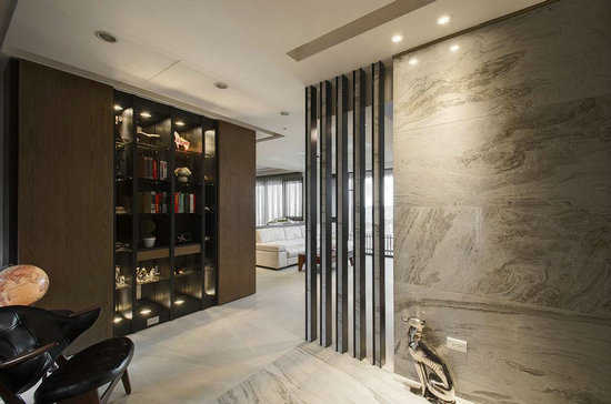 编辑点评:对称式收纳鞋柜、中间段落以层板设定,可摆放屋主的琉璃收藏,亦可作为转折入室的端景印象。