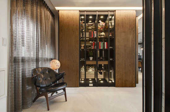 编辑点评:延续着窗框语汇,电视主墙旁铁件与雾面茶玻架构门片,备有储物以及机柜功能。男主人喜爱的飞机模型,在木质浑厚中跳以玻璃清透,化作视觉上的焦点展示。