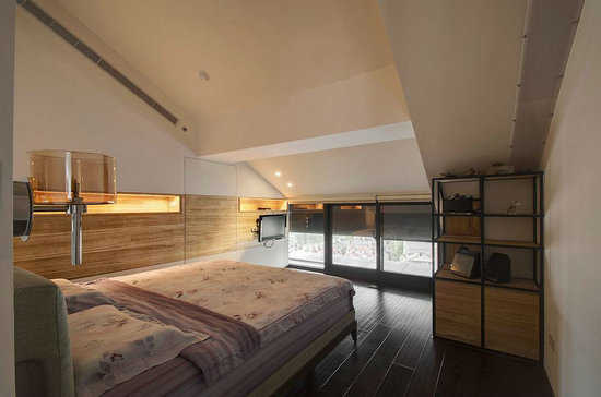 编辑点评:顺应屋顶的梁,以斜屋顶造型修饰,宛若在小阁楼中入眠。
