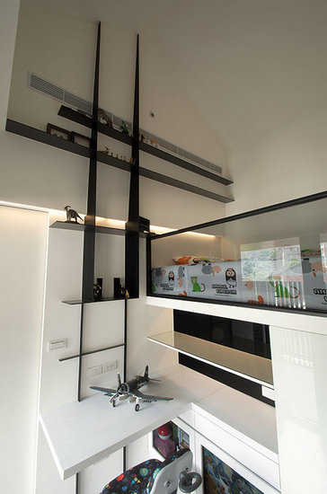 编辑点评:攀岩主题发想的男孩房设计,以黑白色铁件构筑向上延伸的互动视感。