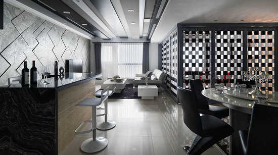 编辑点评:以洞石与人造石打造而成的吧台,后方隐藏了温控酒柜,增加休闲娱乐功能。