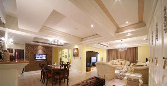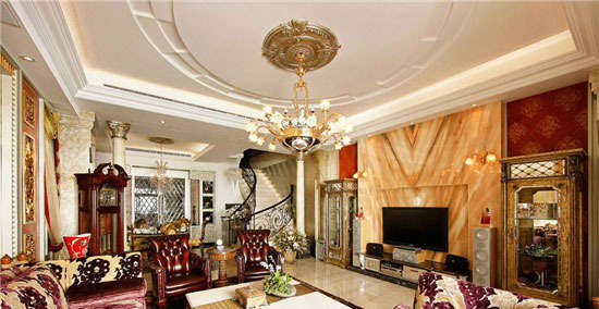 电视墙面运用新奥罗拉大理石略带华丽的纹理,大理石框以内凹设计,让主墙更有层次感。配合两旁有金属质感的展示柜,以可突显主墙的壁纸做背景,极具经典大器轩昂魅力。