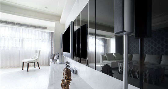 电视背景墙除了运用造型线板与镜面作为主题的配置之外,设计师在墙柱上也富有许多巧思,墙柱上有内嵌式的展示与收纳。