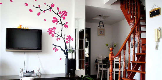 这个电视背景墙有手绘壁纸,纯净的白色搭配靓丽的桃红色,为客厅平添了一份俏丽和浪漫。
