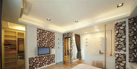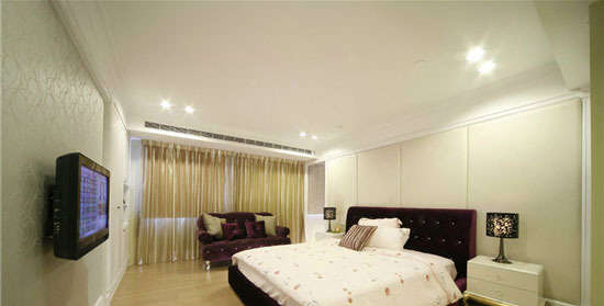 主卧以多层次的中性色彩铺陈,色泽温和的四片裱布作为床头主墙面,衬托深紫色绒布质感的床头饰板。而电视背景墙壁纸则为淡雅的花纹,整个卧室透露出一股素雅之风。